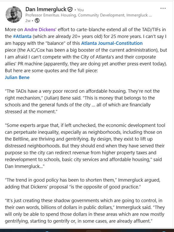 First, I think a very brief explanation of the policy proposal and tax increment financing, called tax allocation districts (TADs) in Georgia, is required here. The AJC article concerned a major proposal by the Mayor to extend all of the TADs in the City of Atlanta until 2055, which would have major, long-term structural implications for the city’s public finances and its ability to fund basic services, schools, and affordable housing throughout the city. The article included quotes from critics of the proposal, including myself and one other person, but also substantial quotes from the mayor’s chief policy advisor arguing for the blanket TAD extension.